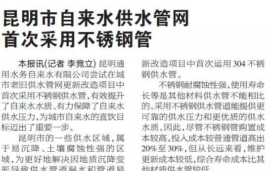 昆明自來水供水管網(wǎng)首次采用304不銹鋼薄壁水管