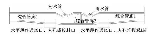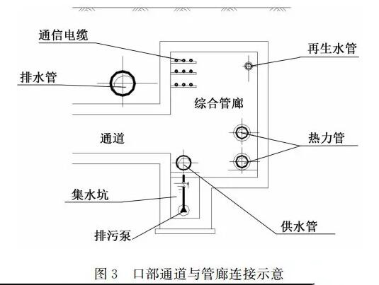 (1)通風口、人孔及投料口等口部與管廊之間的通道和其他管線交叉時,綜合管廊向下折翻,既要確保通道凈高(不小于1.5m)的前提下保證通道頂在排水管以下(每一處都要結合排水管網(wǎng)施工圖詳細計算),又要避開通道在管廊開口處的管線遮擋以免局部管廊埋深和凈高加大。為減小管廊局部下臥深度,以便減小施工難度、降低建設投資,各口部及通道均設在給水及電信線纜一側(cè)??诓客ǖ琅c管廊連接示意見圖3。