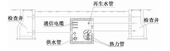 廊內(nèi)一側(cè)敷設給水管道及通信電纜,給水管在下,通信電纜在上;另一側(cè)敷設熱力管道,其上方預留熱水及再生水管線安裝條件;廊內(nèi)中間考慮0.9m的檢修通道。