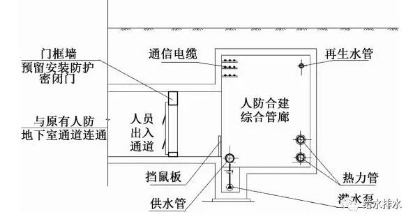 各類管線過人防合建管廊側(cè)壁處,均設計安裝防護套管。供水、再生水及熱力管道過人防通道外墻或臨空墻時,其內(nèi)側(cè)加設防爆波閥門。