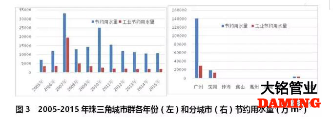 珠三角城市群2005-2015年期間,只有廣州市有完整的節(jié)約用水?dāng)?shù)據(jù),深圳、東莞、江門和肇慶2010年前有個(gè)別年份的節(jié)約用水?dāng)?shù)據(jù),珠海、佛山、惠州和中山則完全沒有進(jìn)行統(tǒng)計(jì)。2008年整個(gè)城市群節(jié)約用水量達(dá)到高峰,之后逐年下滑(見圖3左)。工業(yè)節(jié)約用水比重占全部節(jié)約用水總量的29.2%,廣州市為21.4%(見圖3右)。