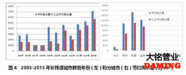 長株潭城市群2005-2015年期間,節(jié)約用水量從2013年一年呈增長趨勢,70%的節(jié)約用水來自工業(yè)部門(見圖4左)。該城市群沒有一個(gè)城市對節(jié)約用水?dāng)?shù)據(jù)進(jìn)行連續(xù)統(tǒng)計(jì),湘潭、益陽、衡陽和婁底四個(gè)城市則完全沒有節(jié)約用水統(tǒng)計(jì)數(shù)據(jù),株洲、岳陽和常德三個(gè)城市節(jié)約用水量占城市群節(jié)約用水總量的99.6%(見圖4右)。事實(shí)上,長株潭城市群2003年至2011出現(xiàn)了嚴(yán)重的缺水狀況,已經(jīng)嚴(yán)重影響了該區(qū)域經(jīng)濟(jì)發(fā)展[4]。節(jié)約用水勢在必行。