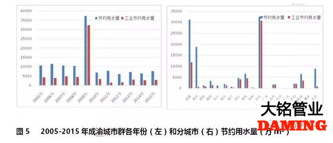 成渝城市群2005-2015年期間,除去2009年異常值外,各年份節(jié)約用水總量低于1億m³,工業(yè)節(jié)約用水占比為52.8%(見圖5左)。成渝城市群節(jié)約用水主要來自成都、自貢和重慶(占全部節(jié)約用水總量的67.33%);廣安、巴中、雅安沒有統(tǒng)計(jì)節(jié)約用水;工業(yè)用水節(jié)約占比前三位的城市分別是達(dá)州、瀘州和自貢;重慶市工業(yè)節(jié)約用水占比為3.5%(見圖5右)。