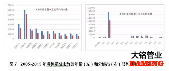 京津冀城市群水資源十分缺乏,但在用水效率提高的前提下,可以通過調(diào)整產(chǎn)業(yè)規(guī)劃與用水定額來實(shí)現(xiàn)用水總量的零增長。2005-2015年期間,2007年節(jié)約用水量達(dá)到高峰,之后逐年下降(見圖1左)。