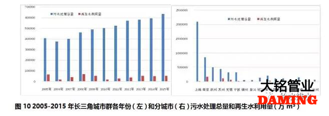 長三角城市群2005-2015年期間,污水處理總量持續(xù)增長,2015年是2005年的1.55倍。但再生水利用量并沒有顯著增長,再生水利用總量僅占污水處理總量的9%,各年份之間差異較大,總體呈現(xiàn)減少趨勢,2015年為2005年利用量的79%(見圖10左)。上海、南京和杭州的污水處理總量最大,僅上海市就占到全部總量的37%,三個(gè)城市總和占到全部總量的62.5%。南京市和蘇州市再生水利用量最大,分別占到全部總量的35%和23%。再生水利用較少的城市有上海、杭州、嘉興、紹興、泰州和臺州(見圖10右)。