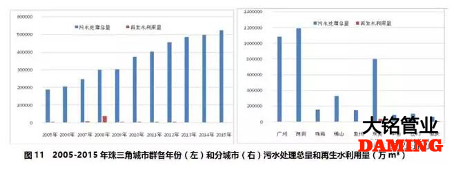 珠三角城市群2005-2015年期間,污水處理總量持續(xù)增加,但再生水利用量并沒有與之同比例增加,再生水利用總量占污水處理總量的占比僅為1.6%(見圖11左)。這可能是由于該地區(qū)雨水豐沛,污水處理后的水作為生態(tài)用水更為經(jīng)濟(jì)[1]。2008年珠三角城市群再生水利用量達(dá)到峰值,且主要來自東莞市和肇慶市(見圖11右)。