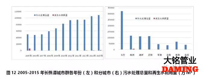 長株潭城市群2005-2015年期間,污水處理總量持續(xù)增加,2015年污水處理總量達(dá)到10億m³,是2005年的2.2倍。2002-2008年期間廢水排放總量基本與經(jīng)濟(jì)增長水平保持同步遞增趨勢,且廢水排放生產(chǎn)率快速提高,總體環(huán)境污染負(fù)荷較高。盡管長株潭城市群2005年至2010年期間工業(yè)廢水排放達(dá)標(biāo)率持續(xù)改善,但區(qū)域上中下游城市污水集中處理率分別為15.3%、31.8%、49.4%,水污染問題嚴(yán)重。2009年是長株潭城市群污水處理量提升的一個(gè)關(guān)鍵年份,2009年以后污水處理量大幅度提升,這可以有效改善區(qū)域生態(tài)環(huán)境資源承載能力。但再生水利用量沒有同比例增加,其用量僅為污水處理總量的1.2%(見圖12左)。除長沙和株洲外,湘潭、岳陽、常德、益陽、衡陽和婁底這六個(gè)城市均無再生水生產(chǎn)和利用行為(見圖12右)。研究表明,長株潭城市群2030年城市化率達(dá)到90%、第二產(chǎn)業(yè)和第三產(chǎn)業(yè)持續(xù)增長的態(tài)勢下,只有將污水處理率提高到100%、污水回用率提高到35%的條件下,才不會(huì)產(chǎn)生水資源供需缺口狀況[7]。提升城市群再生水利用率是實(shí)現(xiàn)水資源供需平衡的一個(gè)重要措施。