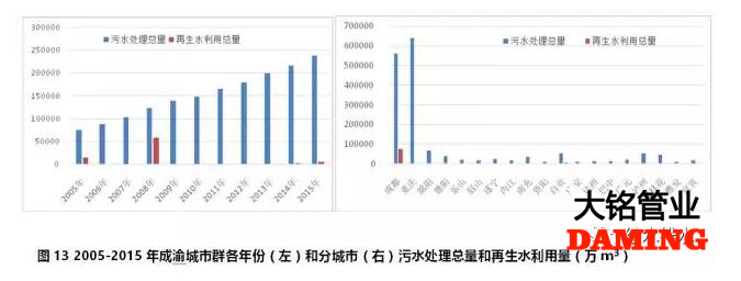 成渝城市群2005-2015年期間,污水處理總量持續(xù)增加,2015年污水處理總量達(dá)到13.8億噸,是2005年3.12倍。但再生水利用量沒有增加,反而比2005年降低了60%??傮w上,再生水利用總量僅為污水處理總量的5.2%(見圖13左)。再生水利用量最多的城市是成都市,達(dá)到7.39億m³,主要來自2005-2008年期間,2008年當(dāng)年利用量達(dá)到58150萬m³,但2009年僅為35萬m³,2013年以后再生水利用量為零。重慶市自2006年啟動(dòng)再生水利用以來逐年增加,從2006年的118萬m³,增長到2015年的854萬m³,增長了7.23倍。沒有統(tǒng)計(jì)或再生利用較少(見圖13右)。