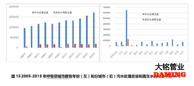 呼包鄂城市群2005-2015年期間,污水處理總量持續(xù)增加,2015年是2005年的1.79倍;再生水利用占污水處理總量的10.5%,2015年是2005年的3.5倍,2011年再生水利用量增長幅度很小(見圖15左)。再生水利用主要來自三個(gè)城市,武漢市、包頭市和呼和浩特市,占城市群全部再生水利用總量的97%,武漢市更是占到了81%,黃石和十堰市有很小比例的再生水利用(見圖15右)。